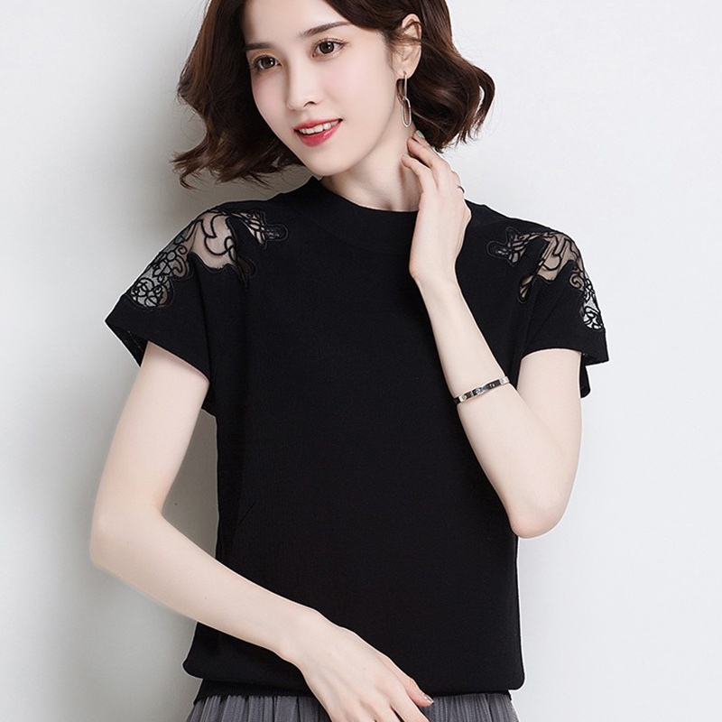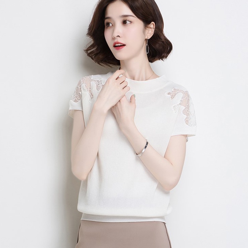 法式刺繡網紗蕾絲短袖女上衣2022夏季新款冰絲針織衫薄款洋氣T恤