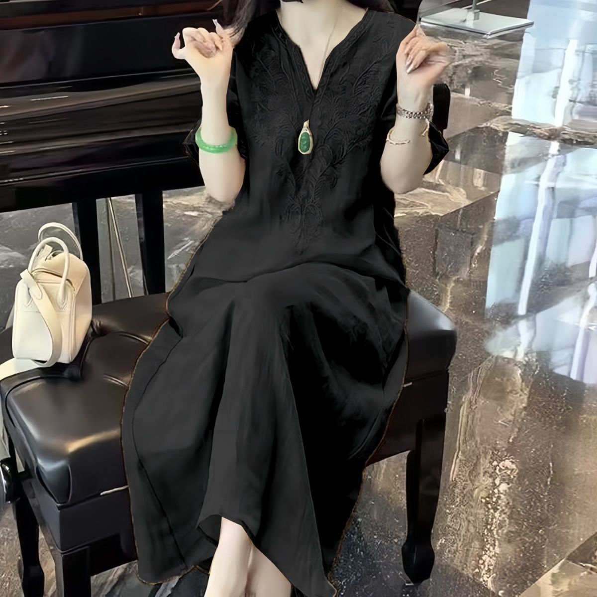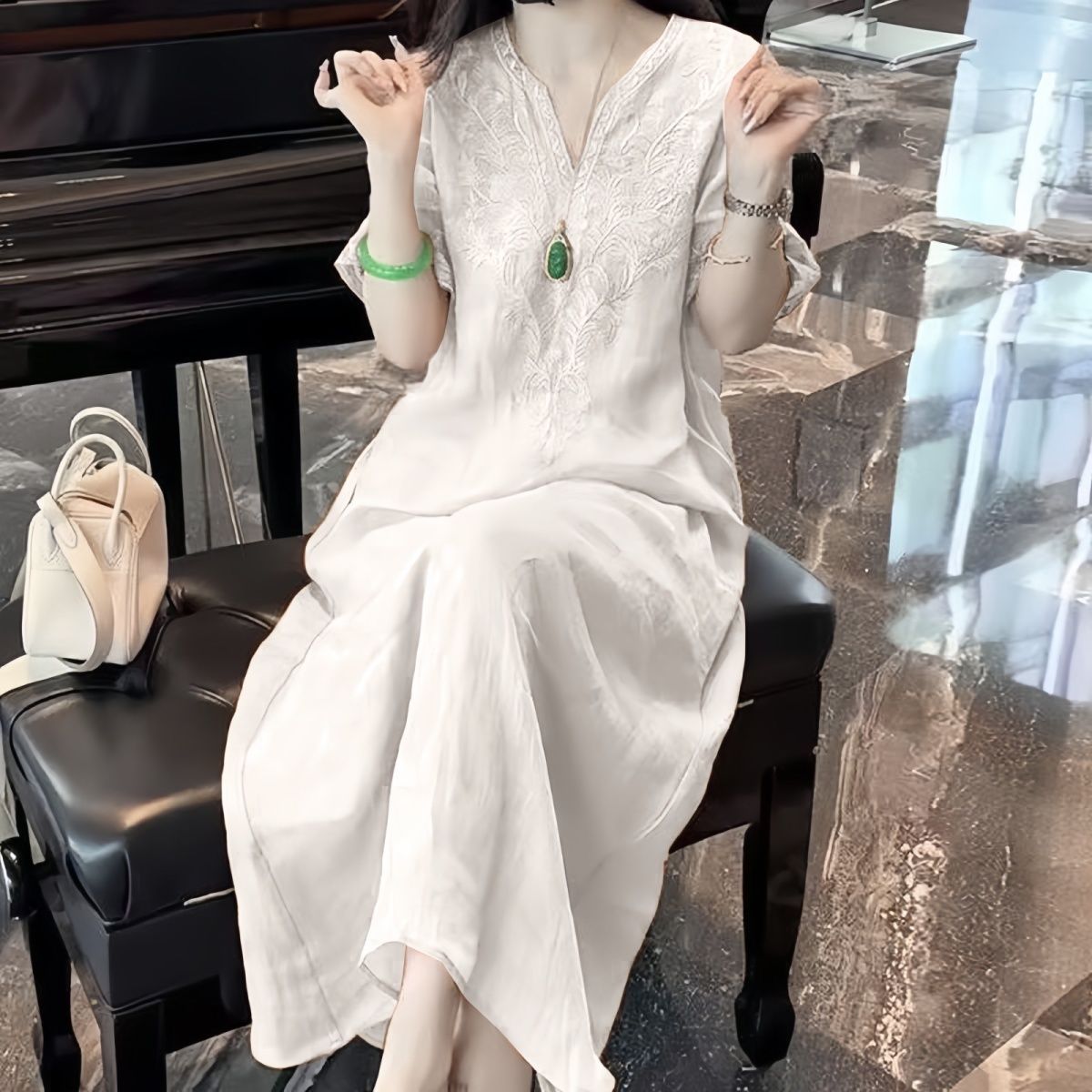 慵懶風苎麻連身裙 V領設計勾勒鎖骨 短袖遮贅肉 苎麻材質透氣 刺繡點綴胸口 隨性又帶著細節美 日常出遊都好搭
